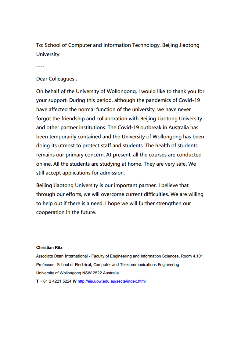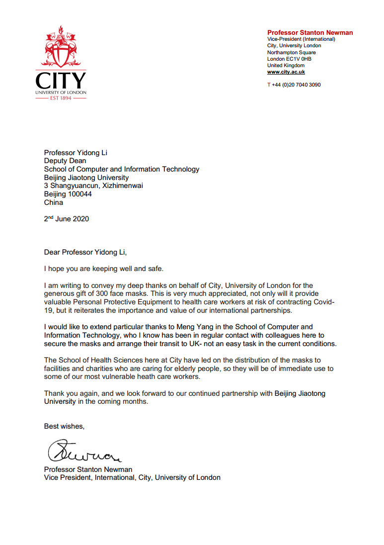 伍伦贡大学电子,计算机与电信工程学院副院长Christian Ritz教授在信中写到,“我代表伍伦贡大学,感谢您的支持。这段时间,尽管新冠肺炎已经影响了正规电子游戏的基本运转功能,但我们从未忘记和澳门正规电子游戏平台的友谊和合作”,“澳门正规电子游戏平台是我们的重要合作伙伴。我相信我们可以共渡难关,如果贵校需要任何帮助,我们一定伸出援手。我希望在未来进一步加强双方合作”。伦敦城市大学副校长Stanton Newman教授在信中写到,“我代表伦敦城市大学向您表示深深的感谢,您慷慨捐赠的口罩不仅向奋战在抗击新冠肺炎一线的工作人员提供了宝贵的个人防护物资,更是重申了我们国际合作关系的重要性和价值”,“我想特别感谢澳门正规电子游戏平台的杨萌女士,她和我的同事们多次沟通,最终将口罩顺利寄到了英国,在目前的情况下这不是一件容易的事”。