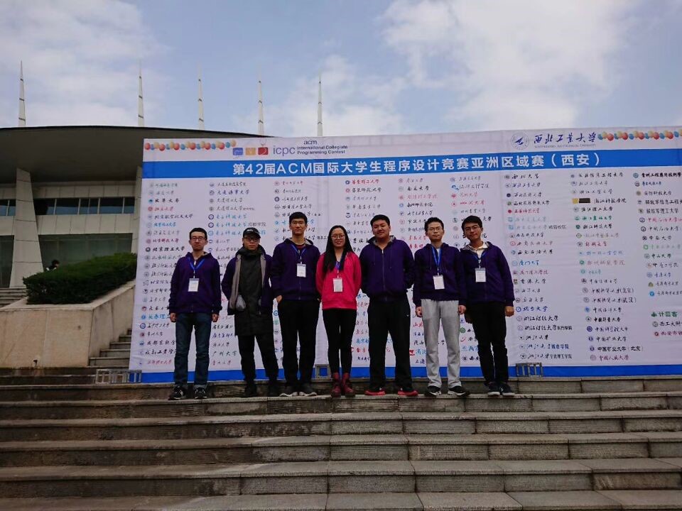 ICPC西安站参赛队伍(左起杨东学、梁伯翰、王楚涵、许华婷-教练、金睿琦、刘雅清、孙庆岩)