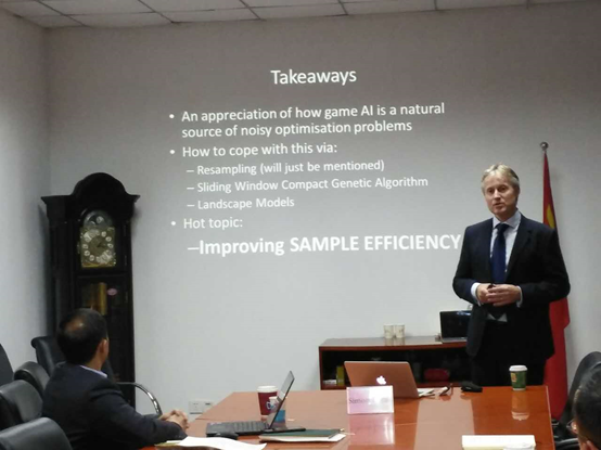 随后,Simon Lucas教授为正规电子游戏师生做题目为“Game AI, Game Design and Noisy Optimisation”的讲座,并与师生热烈讨论。