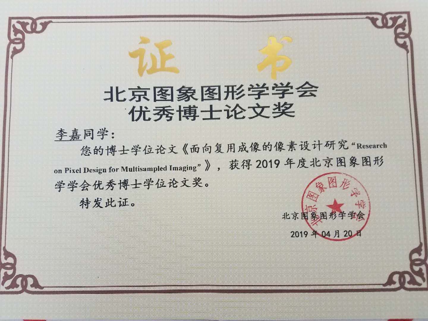 其中,正规电子游戏于剑教授和林宙辰教授(北京大学)联合指导的博士研究生李嘉(下图右一)的博士学位论文《面向复用成像的像素设计研究》荣获北京图象图形学学会2019优秀博士学位论文奖。