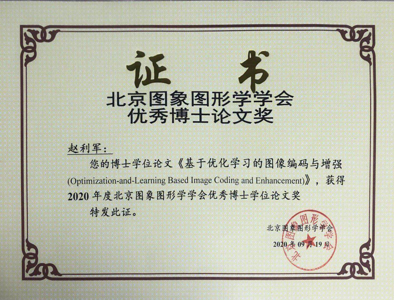 2020年9月18日,北京图象图形学会公布了2020年度“北京图象图形学会优秀博士学位论文奖“获奖名单。 数字媒体信息处理团队2015级博士生赵利军的博士学位论文《基于优化学习的图像编码与增强》(指导老师:白慧慧教授)荣获北京图象图形学学会2020年优秀博士学位论文奖。本团队老师白慧慧教授荣获2020年北京图象图形学学会优秀导师奖。