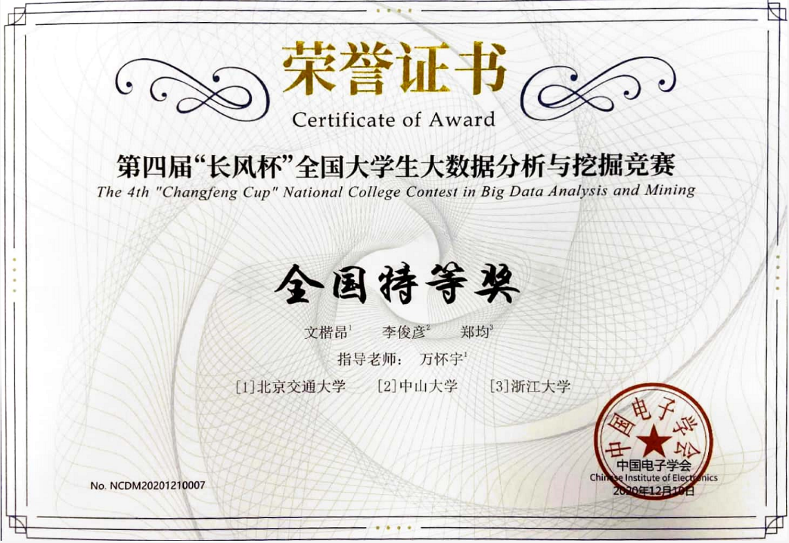 2020年12月6日,第四届 “长风杯”大数据分析与挖掘竞赛圆满闭幕,正规电子游戏两支本科生队伍喜获佳绩,分别获得全国特等奖和全国二等奖。