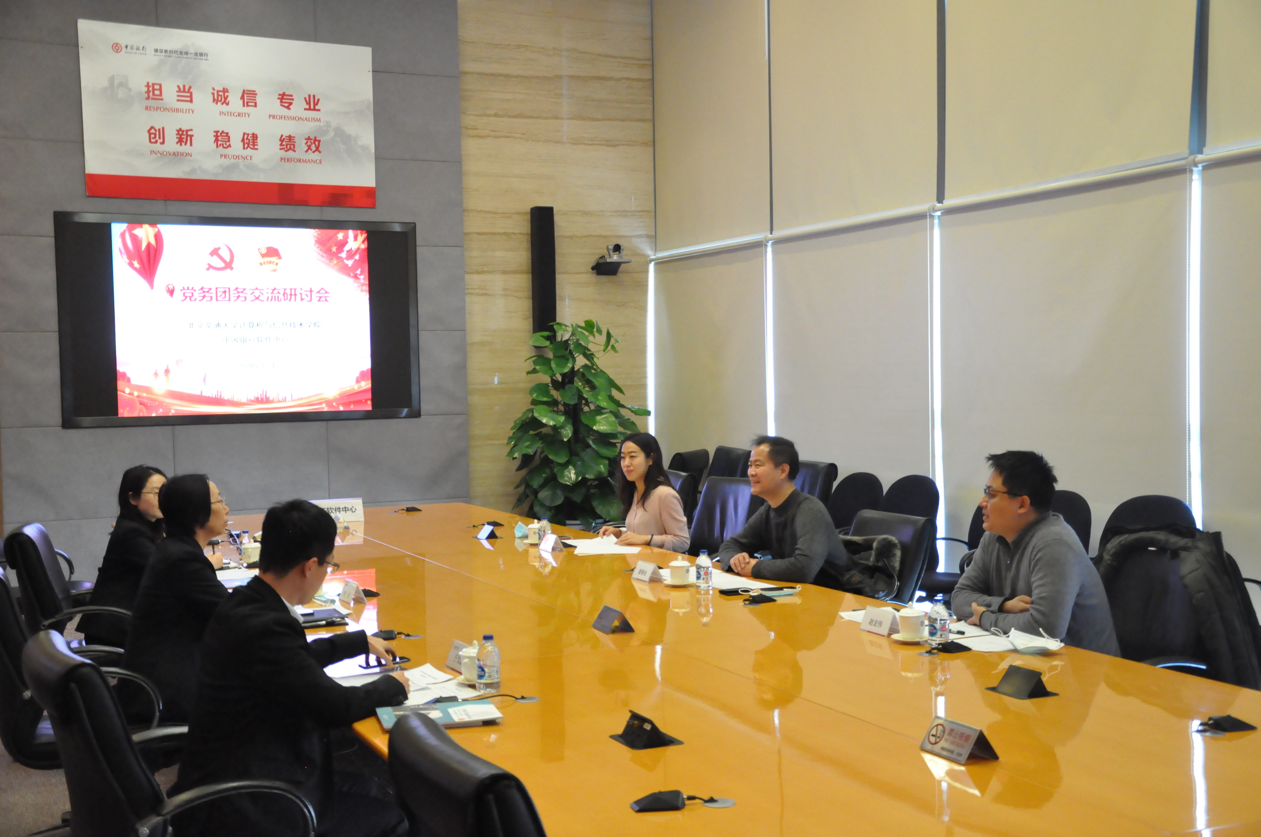 2020年12月31日下午,澳门正规电子游戏平台副书记兼副院长董敬祝、研究生服务中心主任赵宏伟、研究生辅导员周艺走访了中国银行软件中心,与中国银行软件中心党务工作部主管、团委书记何灵等相关负责人就联合党建、团建、校企合作等方面进行了深入交流。