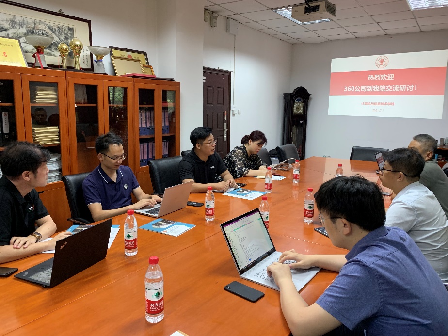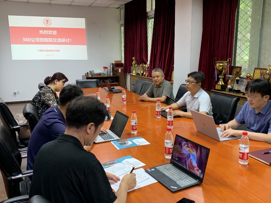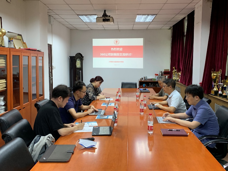 2021年7月7日下午,澳门正规电子游戏平台在九教北111会议室召开了与360公司的产学合作交流研讨会。360公司教育事业部总经理李强等一行四人到访,会议由副院长熊轲主持,信息安全专业王健、李超等老师出席了此次研讨会。