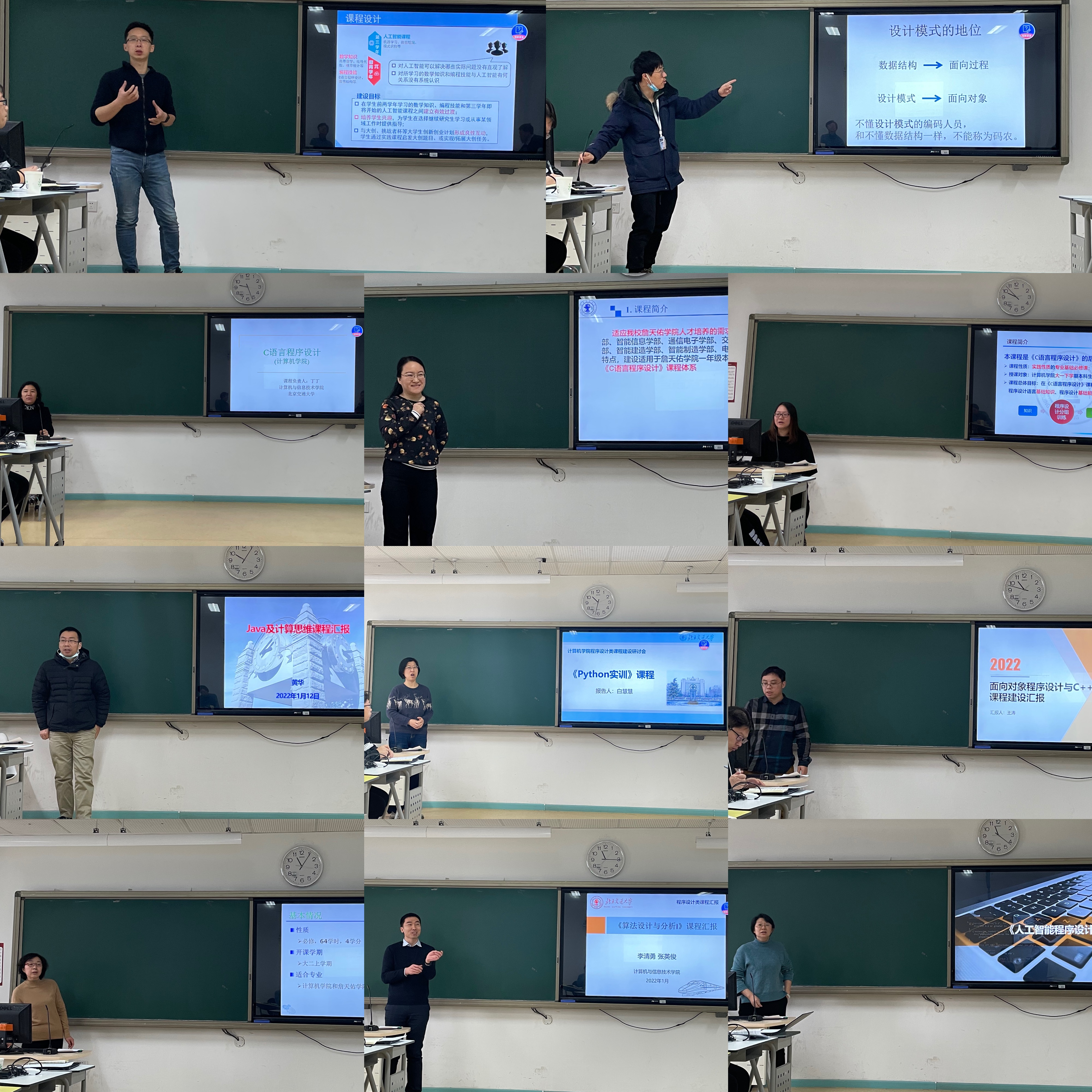 13门课程的负责人汇报了课程基本信息、团队成员,并对标5所以上国际/国内同类院校该课程的情况,从教材、课程设计、考核方式、存在的问题以及课程建设计划/建议等多个维度详细汇报了课程的建设和实施情况。