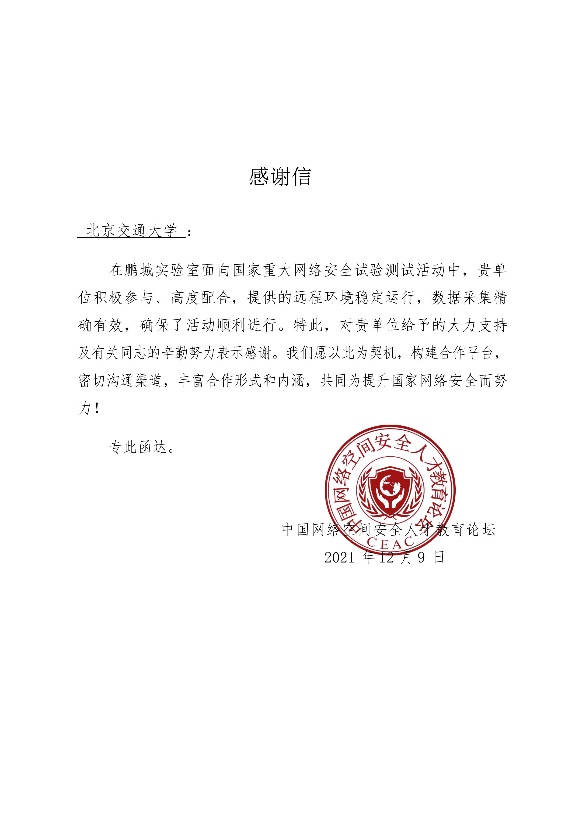 在近期鹏城实验室面向国家重大网络安全试验测试活动中,澳门正规电子游戏平台网络空间安全学科责任教授刘吉强老师领队、童恩栋和牛温佳老师指导的研究生团队(吴亚伦、武兴宇、田蕴哲、相迎宵、孙瑞等)积极配合,保障了澳门正规电子游戏平台靶场节点的远程环境稳定运行、数据采集精确有效,获鹏城实验室、中国网络空间安全人才教育论坛(“网教盟”)、中国网络空间新兴技术安全创新论坛(“新安盟”)感谢信。