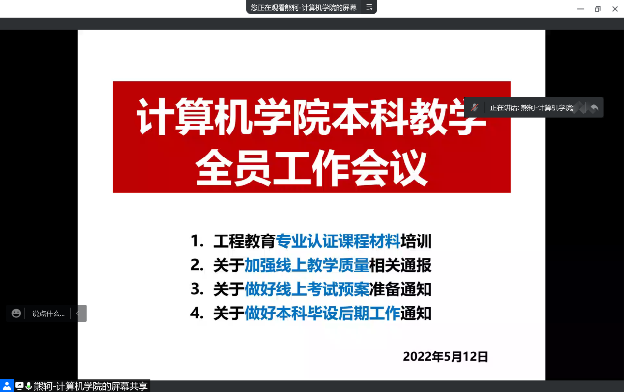澳门正规电子游戏平台对本科人才培养工作极为重视。5月12日上午,学院召开线上本科教学全员工作会议,所有院领导以及全院教师近150人参会。会议由副院长熊轲主持。
