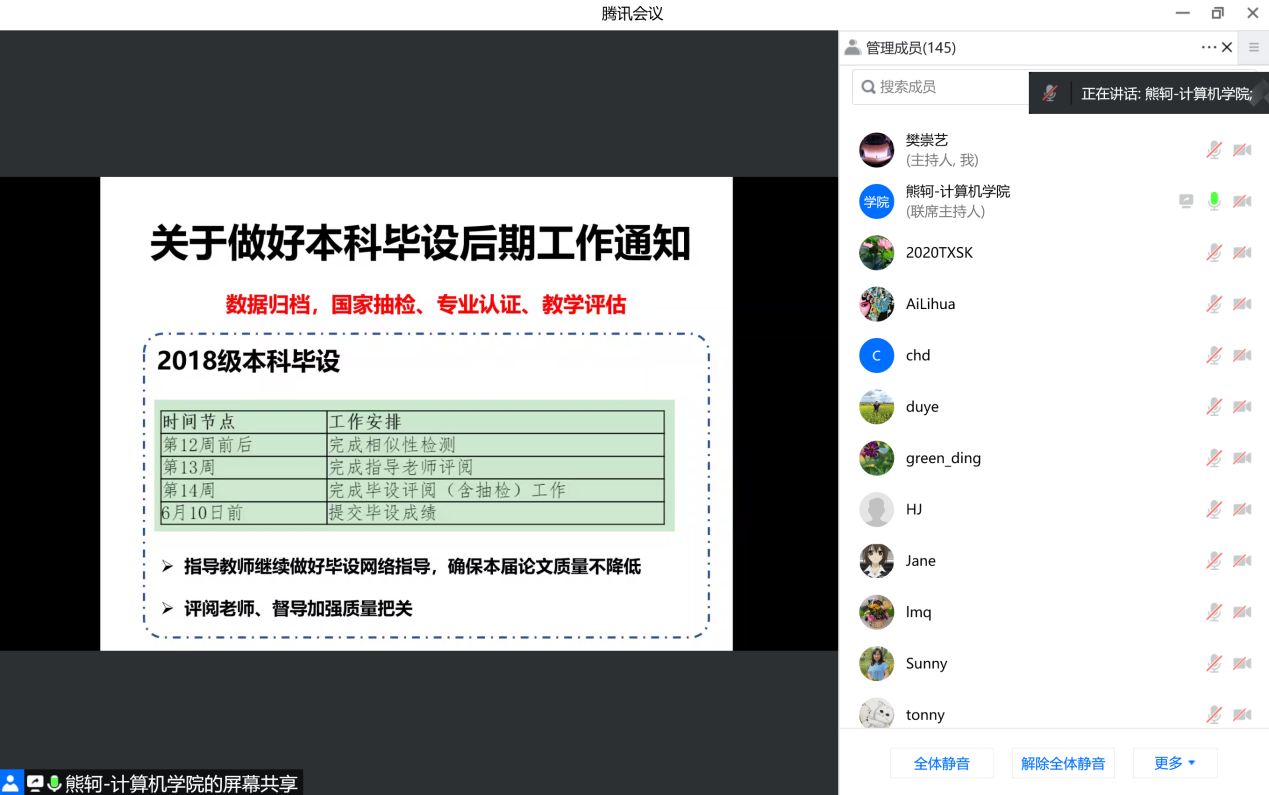 之后熊轲通报了前9周线上教学督导和学生的调研结果,强调当前疫情态势依然严峻,随着本学期线上教学活动的持续,学生、家长和老师都出现了一定程度的焦虑情绪,全院教师要重视线上课堂教学质量、加强与学生的在线互动及答疑、积极配合校院两级督导的听课和指导、及时向学院反馈线上教学出现的新情况,课程负责人要组织任课教师团队针对课程特点进行线上教学研讨、提前做好期末线上考试的预案,本科毕业设计导师要切实做好对学生的指导和毕设论文工作质量的把关,并对近期学院教学工作重点进行了说明和具体部署。他还指出,老师们要以本次专业认证为契机,深化对本科人才培养质量的理解,进一步规范课程的教学活动,把学院本科教学工作质量推向新的高度。