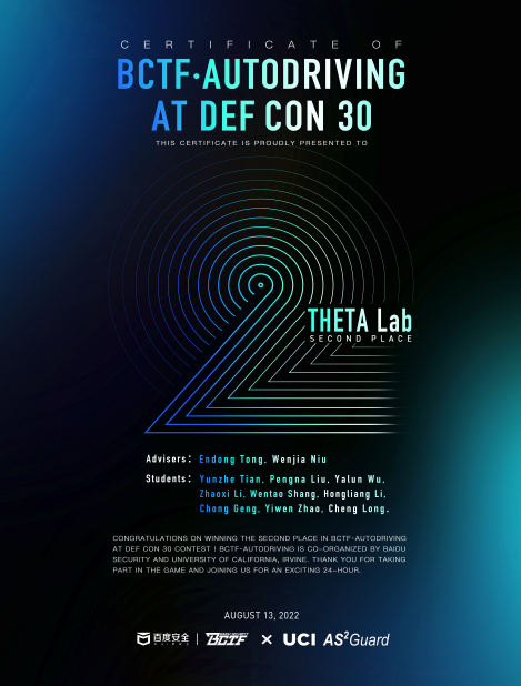 2022年8月14日零点,由百度安全(BCTF)和加州大学尔湾分校(UCI)联合承办的DEFCON 30 BCTF AutoDriving赛事圆满落下帷幕。正规电子游戏网络空间安全学科责任教授刘吉强老师领队、信息安全系童恩栋老师和牛温佳老师指导的“THETA Lab”团队突破了23道赛题获得4310分,在百余支国内外高校战队中位列解题榜第二名。这是该团队在DEFCON(被称为黑客“奥斯卡”)的赛事中的第二次获奖,是对去年获奖的又一次沿袭。