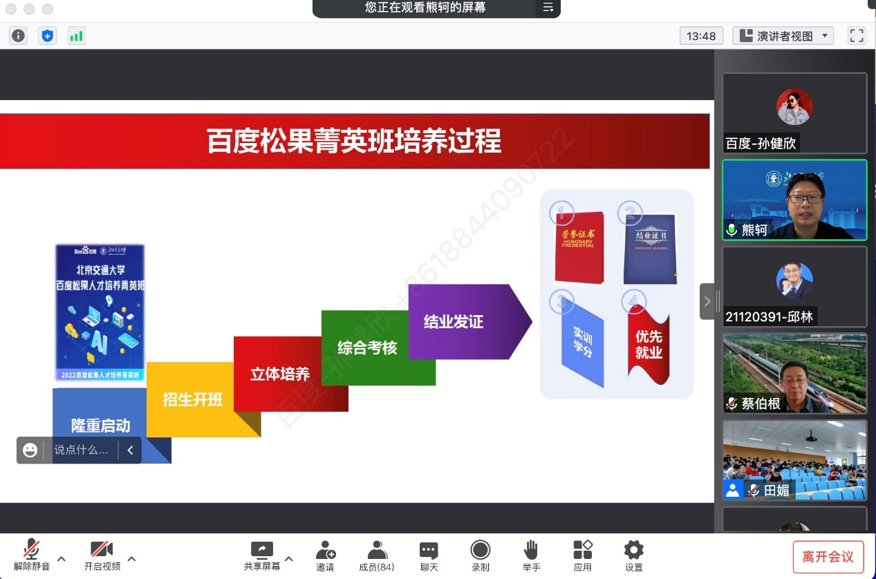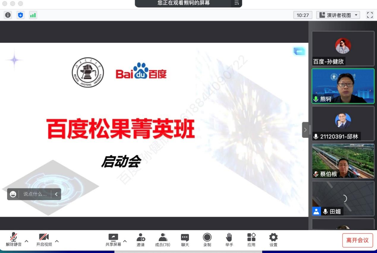 2022年9月25日上午,计算机与信息技术学院联合百度公司,面向2022级本科生成功召开了2022澳门正规电子游戏平台-百度松果人才培养菁英班启动会。澳门正规电子游戏平台澳门正规电子游戏平台院长蔡伯根、副院长熊轲、松果精英班班主任田媚、百度高校合作部副总监计湘婷、百度高校合作部高级经理张倩、百度松果精英班百度侧班主任孙健欣、乔文慧等出席了启动会。会议由熊轲副院长主持。