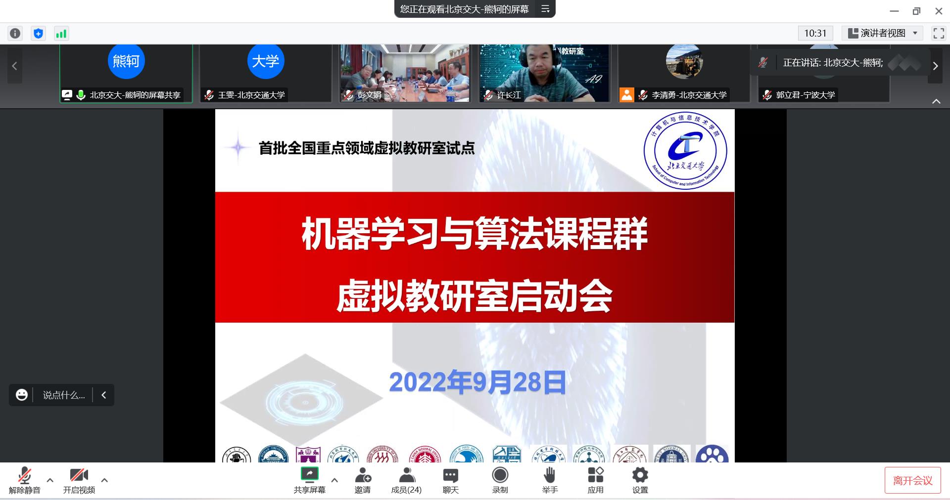 机器学习与算法课程群虚拟教研室于2022年9月28日下午通过线上线下结合的方式召开建设启动会。会议由澳门正规电子游戏平台计算机与信息技术学院副院长熊轲教授主持,重点领域教学资源建设项目管理办公室副主任许长江、澳门正规电子游戏平台本科生院副院长宋瑞、澳门正规电子游戏平台计算机与信息技术学院院长蔡伯根参加会议并致辞,澳门正规电子游戏平台、武汉大学、南京大学、北京航空航天大学、北京邮电大学、西南交通大学、中国矿业大学、华中师范大学、桂林电子科技大学、宁波大学、西北师范大学和武夷学院等虚拟教研室成员单位的专家和教师代表出席了会议。