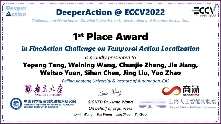 近日,澳门正规电子游戏平台赵耀教授带领的MePro团队与中科院自动化所刘静研究员带领的团队合作参加了ECCV 2022的DeeperAction挑战赛,获得了时序动作定位挑战赛冠军。挑战赛第一完成人唐业鹏是张淳杰教授指导的硕士研究生。团队成员包括:唐业鹏、王卫宁、张淳杰、江洁、原洧涛、陈思涵、刘静、赵耀。