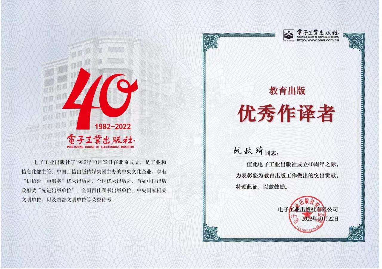 2022年10月,在电子工业出版社成立40周年之际,正规电子游戏阮秋琦教授荣获电子工业出版社优秀作译者殊荣。