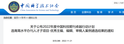 日前,中国科协根据《中国科技期刊卓越行动计划实施细则》《关于征集 2022 年度中国科技期刊卓越行动计划优秀主编、优秀编辑、优秀审稿人工作案例的通知》有关规定,经公开申报、资格审查、专家评审、结果公示,确定 2022 年度中国科技期刊卓越行动计划选育高水平办刊人才子项目-优秀主编、编辑、审稿人案例遴选汇编项目入选案例。