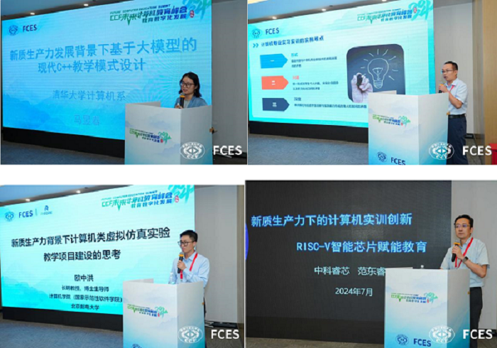 接着,清华大学马昱春教授分享了《新质生产力发展背景下基于大模型的现代C++教学模式设计》,为与会者提供了基于大模型的特色化C++课程教学新模式的宝贵经验。安高云教授则通过《探索计算机类双环协同实习实训教学新模式,服务新质生产力提升》,展示了正规电子游戏在计算机实习实训教学新模式中的实践成果。北京邮电大学欧中洪教授以《新质生产力背景下计算机类虚拟仿真实验教学项目建设的思考》为题,分享了在新质生产力背景下对计算机类虚拟仿真实验教学项目建设的深入思考与见解。中科睿芯集团董事长范东睿分享了《新质生产力下的计算机实训创新RISC-V智能芯片赋能教育》,深刻探讨了在新质生产力快速发展的背景下,计算机实训创新RISC-V智能芯片赋能教育的重要性、现状、挑战及未来发展方向。