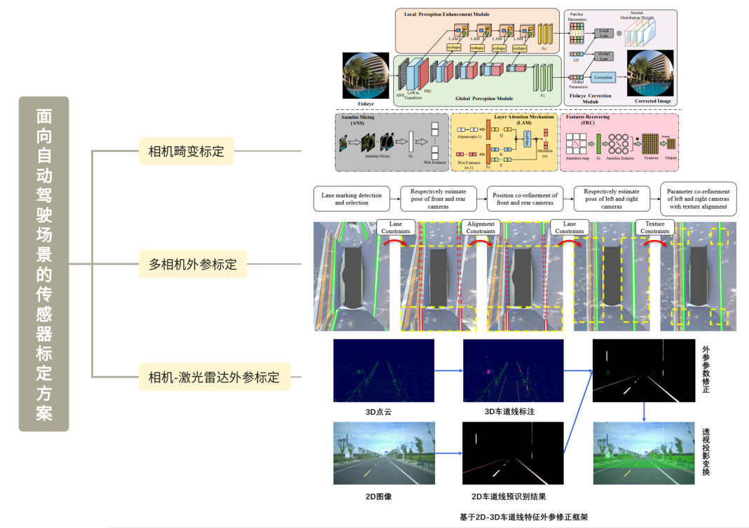 作品介绍:随着自动驾驶产业的快速发展,高阶辅助驾驶功能及自动驾驶车辆有望逐渐普及。这些车辆依靠车身的多种传感器来感知环境并进行行驶决策。因此,确保传感器准确标定至关重要。本项目聚焦于此,运用人工智能技术实现相机畸变参数、多相机外参及相机-激光雷达外参标定。通过融合深度学习技术与传统几何成像约束,从而实现高效准确标定参数预测,助力高效的自动驾驶车辆的离线与在线标定,为自动驾驶技术的进一步发展应用提供有力支撑。