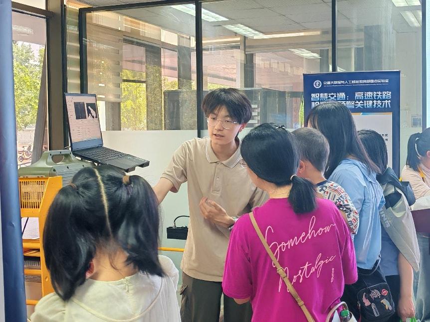 科普活动如期举行。开场前20分钟,科普教育基地门前就来了很多热心的小朋友和家长,报名心仪的“把‘巡检车’带回家”项目。机器人的开场舞蹈,让大家沉浸在兴奋和欢乐之中。随后,小朋友们围坐在“高铁轨道巡检视觉感知”虚拟仿真项目前,目不转睛地看着屏幕上巡检车在虚拟轨道上精准识别病害。快问快答,小朋友的知识丰富程度超出了老师们的预想。小朋友还亲手拼搭了纸板模型,兴奋地说要把“巡检车”带回家。活动通过具象化的科技场景,让 "大国重器" 触手可及。