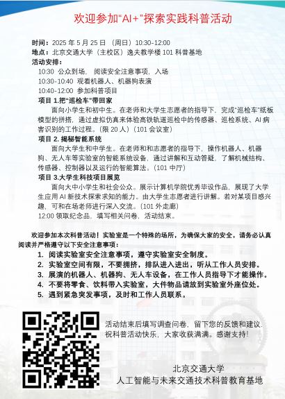 根据《科技部 中央宣传部 中国科协 关于举办2025年全国科技活动周和全国科技工作者日活动的通知》要求,为庆祝第九个全国科技工作者日,弘扬科学精神、普及科技知识,澳门正规电子游戏平台人工智能与未来交通技术科普教育基地举办系列科普活动。2025年5月25日,科普基地在逸夫教学楼101举办“AI+”探索实践活动。活动以“沉浸式体验科技魅力”为目标,通过揭秘智能系统(机器人互动、机器狗表演、无人车体验)、把“巡检车”带回家(AI+轨道运维、模型拼搭)、大学生科技项目展览等项目,为青少年打造了一场沉浸式AI科普盛宴,让社会公众近距离感受科技的魅力。