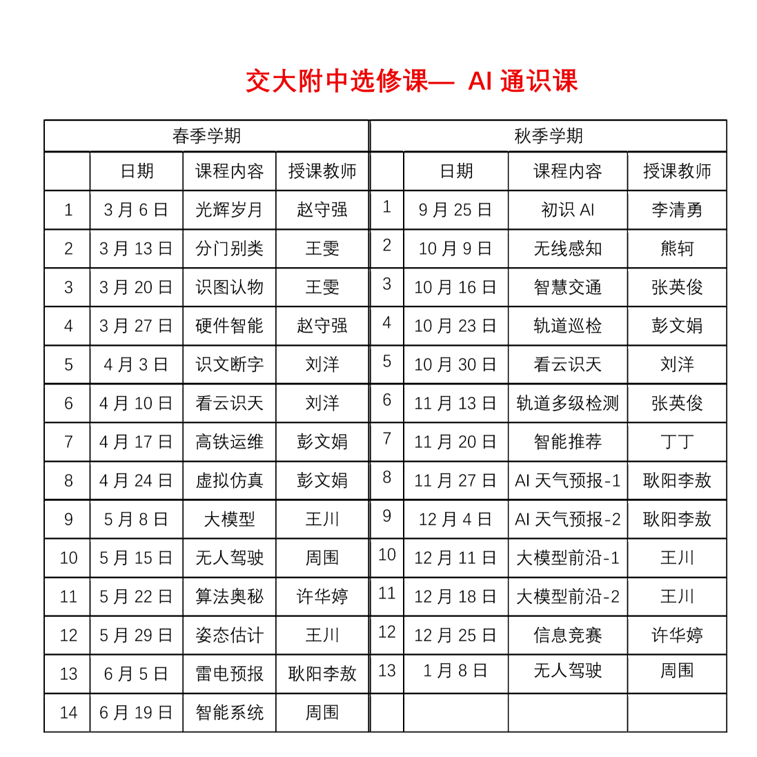 课程内容覆盖从基础原理到前沿应用,注重知识、技能、思维与价值观的有机融合,旨在培育学生四位一体的核心素养。课程以专题形式开展,以AI 与生活为切入点,从AI发展简史、核心概念导入,逐步延伸至机器学习、计算机视觉、自然语言处理等核心技术,再拓展到智慧交通、智慧天气等实际应用场景。教师团队来自教学和科研一线,凭借深厚的学术积淀与丰富的教学经验,将复杂的算法逻辑转化为直观的案例和演示,用生动的短视频、互动式图表,让抽象的 AI 知识变得可感可知,让大学课程能让高中生听明白。