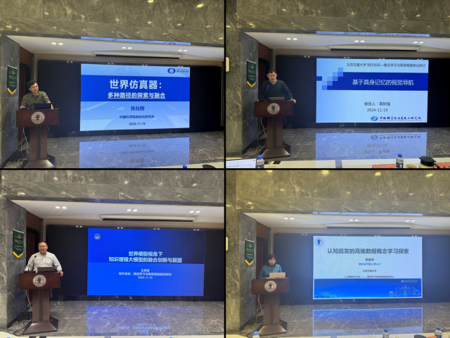 19日,中国科学院自动化所张兆翔研究员以“世界仿真器:多路径的探索与融合大模型技术”为题,分享了其团队在世界仿真器相关路线上的初步探索及应用落地成效。中国科学院计算所蒋树强研究员以“基于具身记忆的视觉导航”为题,分享了其团队在具身导航的最新研究方向及进展,并进行了虚拟到现实环境的演示。同济大学王昊奋研究员以“世界模型角度下知识增强大模型的融合创新与展望”为题,分析了世界模型和知识增强大模型前沿研究案例和最新技术发展趋势,并结合垂直领域的落地应用展望了未来技术范式。澳门正规电子游戏平台景丽萍教授以“认知启发的高维数据概念学习探索”为题,从心理学与认知科学角度出发,探索高维数据概念表示、学习和解释理论和方法,并对认知启发的概念学习进行了展望。